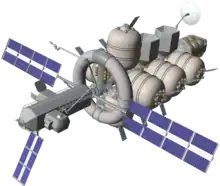 In order to deploy this massive spacecraft as easily as possible, it would consist of a variety of rigid and inflatable modules and solar dynamic arrays. The expandable modules are based on the technology used by the inflatable living quarters proposed by Bigelow Aerospace,[5] which has continued the development of inflatable modules initially designed and developed by NASA.[6]