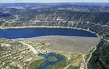 Navajo Dam is a dam on the San Juan River, a tributary of the Colorado River, in northwestern New Mexico in the United States. The 402-foot (123 m) high earthen dam is situated in the foothills of the San Juan Mountains about 44 miles (71 km) upstream and east of Farmington, New Mexico.[3] It was built by the U.S. Bureau of Reclamation (Reclamation) in the 1960s to provide flood control, irrigation, domestic and industrial water supply, and storage for droughts. A small hydroelectric power plant was added in the 1980s.