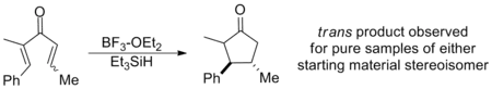 Similarly, β-substitution directed inward restricts the s-trans conformation so severely that E-Z isomerization has been shown to occur in advance of cyclization on a wide range of substrates, yielding the trans cyclopentenone regardless of initial configuration. In this way, the Nazarov cyclization is a rare example of a stereoselective pericyclic reaction, whereas most electrocyclizations are stereospecific. The example below uses triethylsilane to trap the oxyallyl cation so that no elimination occurs.[2] (See Interrupted cyclizations below)