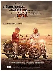 Neelakasham Pachakadal Chuvanna Bhoomi (transl. Blue Sky, Green Sea, Red Earth) is a 2013 Indian Malayalam-language road adventure film directed and co-produced by Sameer Thahir and written by Hashir Mohamed. The film stars Dulquer Salmaan and Sunny Wayne with Dhritiman Chatterjee, Surja Bala Hijam in supporting roles. The movie was a hit at the Kerala box office and has since developed a cult following among the youth of Kerala.[1] The film began shooting in the north-eastern state of Nagaland in February 2013 and completed its shoot in June 2013.[2] The film was shot at real locations in eight Indian states, Kerala, Karnataka, Andhra Pradesh, Tamil Nadu, Odisha, West Bengal, Nagaland and Sikkim.[3]
