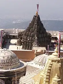 Merutunga also mentions that Sajjana had replaced the previously existing wooden temple, however no other work corroborates this. According to Vijaysensuri, the amalasaraka (top of the spire) of the temple was gilded by Bhavad of Malwa around the 12th century.[6] An inscription in the Shanraja-shila-prashasti mentions that Mandalika I, who was king of Chudasama, had the temple gilded with gold plates in c. 1453-1454 CE.[6][7] Harpal Shah of Khambhat renovated the temple c. 1393 CE on the instruction of Jayatilaksuri of Brihat-Tapa-Gaccha.[6]