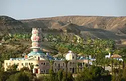 Neot Smadar is located in the southern Negev about 70 km. north of Eilat. The kibbutz was established in 1989,[2] on the grounds of an abandoned kibbutz, Shizafon.[3] The guest rooms' village on a hill nearby was built on the grounds of the abandoned Nahal settlement Ya'alon. Neot Smadar is as an organic community featuring architecturally unique buildings with passive cooling towers. The Art Center houses 14 workshops for Stained glass, ceramics, textile, wood and metals. The building is insulated with mud bricks, with "air conditioning" supplied by a desert cooling tower.