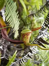 The urceolate pitchers are generally quite small, rarely exceeding 10 cm in height and 7 cm in width. The peristome is greatly incurved, with the inner section accounting for around 85% of its total cross-sectional surface length.[14] Upper pitchers are very rarely produced and are considerably smaller than those formed on rosettes or offshoots. Pitchers range in colouration from light green throughout to completely dark red, with many intermediate forms recorded. The pitchers of N. ampullaria from Sumatra and Peninsular Malaysia are almost exclusively green throughout or green with red speckles; the red forms are mostly confined to Borneo. A large-pitchered form has been recorded from New Guinea.[13][15]