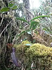 Right: Nepenthes izumiae growing as an epiphyte on a moss-covered branch in upper montane forest