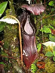 Rosette and lower pitchers are typically ovate in the basal quarter to half of the pitcher cup, becoming cylindrical and sometimes slightly infundibular above. A conspicuous hip often delimits these two parts of the trap. Terrestrial pitchers may be quite large, reaching 30 cm in height by 6 cm in width. A pair of fringed wings (≤6 mm wide) runs down the ventral surface of the trap, bearing filaments up to 12 mm long. The peristome is cylindrical at the front and becomes flattened and broader towards the sides and rear, measuring up to 3 cm in width. It bears ribs up to 2 mm high and spaced up to 2.5 mm apart. These ribs terminate in teeth (≤8 mm long) on the inner margin of the peristome, the largest being located towards the top. There is often a gap of several millimetres separating the two lobes of the peristome directly below the lid. The pitcher lid or operculum is ovate to orbicular and typically has a cordate base as well as a frilled margin. It measures up to 6 cm in length by 4.5 cm in width. A triangular or hook-shaped basal crest (≤1 cm long) is commonly present on the lower surface of the lid. An unbranched spur measuring up to 10 mm in length is inserted near the base of the lid. Lower pitchers typically have a very dark pigmentation, being purplish-black throughout. However, the indumentum covering the traps can give them an orange or brownish sheen. The peristome is generally purple, black, or dark brown, but may have lighter coloured teeth ranging from green, through yellow, to white. The inner surface of the pitcher may be light yellow, white, or light purple, and often bears purple speckles. The pitcher lid is often yellow or green on the underside and dark purple on its upper surface. Occasionally, the pitcher may be yellowish-green throughout with a black peristome.[4]