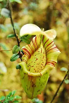 Rosette and lower pitchers are either infundibular in the lower third to half and ovoid above, or ovoid throughout. They reach 25 cm in height and 9 cm in width. A pair of fringed wings (≤15 mm wide) runs down the front of the pitcher. The glandular region covers the lower third to half of the inner surface. The glands are overarched and occur at a density of 400 to 1300 per square centimetre.[2] The pitcher mouth is round and elongated into a wide neck. The peristome is flattened, expanded, and up to 40 mm wide. A series of teeth (≤7 mm wide) line its inner margin. The peristome ribs are spaced 0.5 to 1.5 mm apart. Pitchers bear 14 to 18 longitudinal nerves across their height.[2] The pitcher lid is ovate and usually has a hook-shaped appendage on the underside near the peristome. A branched spur (≤5 mm long) is inserted near the base of the lid.[8]