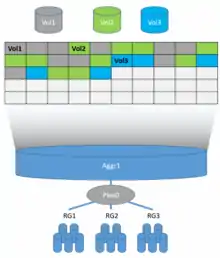 RAID-DP's double parity leads to a disk loss resiliency similar to that of RAID 6. NetApp overcomes the write performance penalty of traditional RAID-4 style dedicated parity disks via WAFL and a novel use of its nonvolatile memory (NVRAM) within each storage system.[7] Each aggregate consist of one or two plexes, a plex consists of one or more RAID groups. Typical ONTAP-based storage system have only 1 plex in each aggregate, two plexes used in local SyncMirror or MetroCluster configurations. Each RAID group usually consists of disk drives of same type, speed, geometry and capacity. Though NetApp Support could allow a user to install a drive to a RAID group with same or bigger size and different type, speed and geometry for temporary basis. Ordinary data aggregates if containing more than one RAID group must have same RAID groups across the aggregate, same RAID group size is recommended, but NetApp allows to have exception in last RAID group and configure it as small as half of the RAID group size across aggregate. For example, such an aggregate might consists of 3 RAID groups: RG0:16+2, RG1:16+2, RG2:7+2. Within aggregates, ONTAP sets up flexible volumes (FlexVol) to store data that users can access.