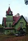 By the 1840s and 1850s, New Brighton including modern-day St. George began to develop into a summer resort area.[30][31] In addition to the existing Pavilion,[26] hotels in modern-day St. George/New Brighton included the Peteler (later St. Marks) Hotel,[32] as well as the Belmont Hotel.[33] Additionally, new houses such as Italianate villas were built, while existing Richmond Terrace mansions were expanded or received new annexes and gardens.[33] Several greenhouses were also built in the neighborhood, particularly on the land of the merchant John C. Green, whose estate is now the site of Curtis High School.[33][34] The silk printer John Crabtree established a printing plant for his company, Crabtree and Wilkinson, on the eastern bank of the Jersey Street brook in 1844.[33][35] The factory had over 180 workers and a small residential and commercial community by 1853, and the establishment of similar factories led to the population of New Brighton doubling between 1840 and 1860.[33]