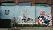 This large mural, painted by a local artist who paints under the name FWID, adorns the side of the warehouse on Richmond Terrace where Gerardi's Farmer Market is located. The three firefighters raising the American Flag in the center of the image strike a pose that is reminiscent of the historic photograph Raising the Flag on Iwo Jima by Joe Rosenthal.