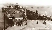 On 3 October 1867, the bridge and landing stage were destroyed by the steamer Galileo during a gale, with the landing stage floating out into the river, although it was rescued by other boats. The landing stage was repaired at a cost of £3,850 (equivalent to £385,000 in 2019) and reopened on 28 May 1868, although work to anchor it more securely to the seabed continued into 1869.[6] Famous divers were also known to have dived off the pier, including Tommy Burns[10] and Ted Heaton.[11] Various schemes to make the pier longer never materialised, resulting in the council often having to dredge sand from around the pier head so that ferries could continue to call.[12] Eventually in August 1881, £22,000 (equivalent to £2,429,200 in 2019) was borrowed to allow for the enlargement of the pier and landing stage.[13]