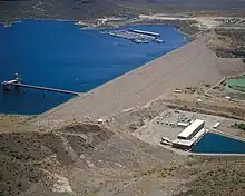 Water from the dam's reservoir is released through its outlet works or power plant to either the Waddell Canal or into Hank Raymond Lake, which is formed just downstream of the dam by the Camp Dryer Diversion Dam. The diversion dam is a composite concrete and masonry dam with a height of 79 feet (24 m) and length of 872 feet (266 m). It can store up to 590 acre-feet (730,000 m3) at an elevation of 1,445 feet (440 m). Water from Hank Raymond Lake is diverted into the Beardsley Canal, which has a main extension 33 miles (53 km) long to serve 60 square miles (160 km2) of the Maricopa Water District (MWD). The Beardsley Canal also has an interconnection 4.5 miles (7.2 km) south of the dam at 33°46′48″N 112°16′54″W / 33.78000°N 112.28167°W with the CAP aqueduct that allows it to receive additional water from that source.[7] Water released into the 4.7 miles (7.6 km) long Waddell Canal first travels under the Agua Fria River via a 2,440 feet (740 m) long siphon before being returned to the surface canal where it continues south to meet the CAP aqueduct just west of Arizona State Route 303. The capacity of the pump-generating plant, Waddall Canal and siphon is 3,000 cubic feet per second (85 m3/s) while the outlet works for the diversion dam and Beardsley Canal are 5,600 cubic feet per second (160 m3/s), but only 4,300 cubic feet per second (120 m3/s) can be diverted to the canals at a time.[8]