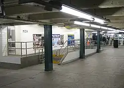 For various reasons, including maintenance costs, decreases in ridership, along with crime and safety issues, many stations have fare control areas, mezzanine areas and entrances that have been closed.[30][31][32] Many mezzanines that previously stretched the entire length of a station have been split or partitioned by fencing or permanent walls. These closed areas have been abandoned or converted into space for Transit Operations or the New York City Police Department.[9][24]