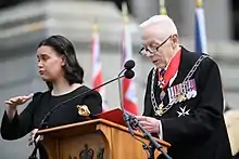 The New Zealand Herald of Arms Extraordinary attends the Governor-General (or the Sovereign, if present) on ceremonial occasions which include the swearing-in of a new Governor-General, investitures of Royal honours, and the ceremonial opening of Parliament.[1] Since at least 2002 the New Zealand Herald of Arms Extraordinary has been the person appointed by the Governor-General to proclaim the dissolution of Parliament.[3][4][5][6]