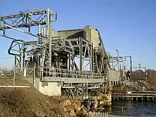 The main bridge structure, a 68-foot (21 m) Scherzer through-girder bascule design, was built by the King Bridge Company in 1907 for the New York, New Haven and Hartford Railroad.[3] The bridge was known as "Old Nan" and cost about $48,000. Overall, it was 294-foot (90 m) long with five spans resting on stone masonry piers and abutments. Remnants of the bridge were donated to the Connecticut Eastern Railroad Museum.[4]