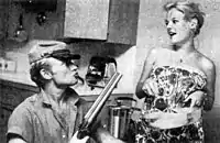 Adams initially may have met James Dean in December 1950 while jitterbugging for a soft drink commercial filmed at Griffith Park.[5] Adams spent three years in the Coast Guard between the time this commercial was shot in late 1950 and the start of filming for Rebel Without a Cause in March 1955. Actor Jack Grinnage, who played Moose, recalled, "Off the set, Nick, Dennis (Hopper), and the others would go out together — almost like the gang we portrayed — but Jimmy and Corey Allen ... were not a part of that."[6] When production was wrapped, Dean said in another press release, "I now regard Natalie (Wood), Nick, and Sal (Mineo) as co-workers; I regard them as friends ... about the only friends I have in this town. And I hope we all work together again soon."[7] Following Dean's 1955 death in an automobile accident, Adams overdubbed some of Dean's lines for the film Giant (these are in Jett Rink's speech at the hotel) and dated co-star Natalie Wood. Adams tried to capitalize on Dean's fame through various publicity stunts, including a claim he was being stalked by a crazed female Dean fan, allowing himself to be photographed at Dean's grave in a contemplative pose, holding flowers, and surrounded by mourning, teenaged female fans along with writing articles and doing interviews about Dean for fan magazines.[8][9][10] He also claimed to have developed Dean's affection for fast cars, later telling a reporter, "I became a highway delinquent. I was arrested nine times in one year. They put me on probation, but I kept on racing ... nowhere."