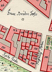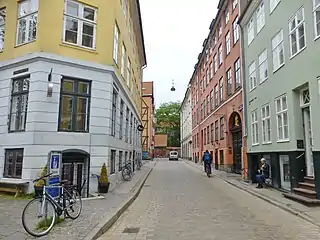 The short section from Valkendorfsgade to Gråbrødretorv (Løvgade) was called Tugthusporten (Jailhouse Gate) after a children's jail established at the site by Christian IV but soon moved to Christianshavn (see Women's Prison, Christianshavn).[2] It was a narrow, vaulted passageway which ran through a building. The building had six window bays along the square and two window bays across the street.[3]
