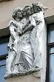 His use of sculpture has been linked to the legacy of Stroganov Institute school that focused on elaborate facade decorations.[3] However, none of contemporary architects used sculpture so frequently and on such scale as Zherikhov. His best known work, a small 4-story apartment building on the corner of Plotnikov and Maly Mogiltsevsky Lane, completed in 1907, features a band of 40 life-sized figures arranged in groups of two or three in explicitly erotic settings.[4] Three of the satyrs resemble Leo Tolstoy, Alexander Pushkin and Nikolay Gogol.[4] The name of the sculptor has been lost; perhaps it was Leeb Sinayev, author of Pushkin Museum friezes, or one of his disciples.[3] Tourist guides say that the building once housed a high-class brothel,[4] but the statement is refuted by historians as an urban legend.[3]