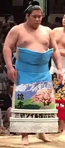 He first stepped onto the dohyō in March 2006. He joined sumo the same time as future top division wrestlers Tochinoshin, Sakaizawa, and Shōhōzan. He worked his way slowly up the ranks, earning sandanme division promotion in July 2008 and makushita in January 2010. However, he struggled in the third division and soon fell back to sandanme.[2] Though he was soon back in makushita he languished at this level. He managed to contend for the makushita' championship in November 2010, where he lost in a multiple wrestler playoff, and won the championship in this division outright with a 6–1 record in November 2012. However, continuing mediocre performances kept him in the third division for four and a half years. During these struggling years, he took the ring name of Nishikigi. He was the first wrestler in 144 years to take this name.[3] However, starting in September 2014, 4 consecutive 5-2 records propelled him to the salaried ranks of jūryō for the May 2015 tournament. Finding his stride, it took him a year to work his way up through jūryō and after recording ten wins in January 2016 he was promoted to the top division makuuchi for the first time.