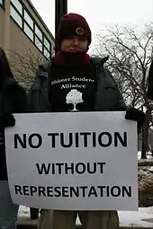 A modified version of the phrase, "no tuition without representation", is sometimes used in disputes over governance in higher education in the United States to emphasize student's rights to a voice in institutional decisions. The term first emerged in a 1977 dispute at Union County College in New Jersey.[93] It has been used more recently in disputes at Dartmouth College,[94] UC Berkeley School of Law,[95] and elsewhere.