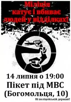 - July 22 - A protest action against police permissiveness titled "Enough telling lies!" took place near police precinct of Sviatoshynskyi District in Kyiv. Relatives and friends of Dmytro Yashuk took part. Protesters demanded to do a proper autopsy of Dmytro Yashuk's body and to tell them the names of suspects of this case.