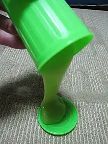 Flubber, also commonly known as slime, is a non-Newtonian fluid, easily made from polyvinyl alcohol–based glues (such as white "school" glue) and borax. It flows under low stresses but breaks under higher stresses and pressures. This combination of fluid-like and solid-like properties makes it a Maxwell fluid. Its behaviour can also be described as being viscoplastic or gelatinous.[11]