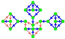 The edges are required to be oriented in such a way that at least two units of weight are oriented towards each vertex: there must be either at least one incoming blue edge, or at least two incoming red edges. An orientation can change by steps in which a single edge is reversed, respecting these constraints.[2]