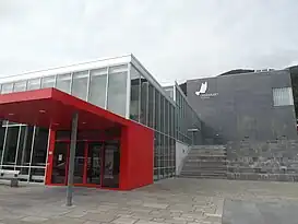 The building also houses a cinema, and a library and is connected to the local upper secondary school. The main stage is 14-metre (46 ft) wide, and 10 m (33 ft) deep, with a capacity of 530 seats. Of these, 218 seats are located in the gallery. When the orchestra pit is in use, capacity is 484. The chamber is specially constructed and adapted for acoustic music, using the same techniques as found in the Oslo Opera House.[25]
