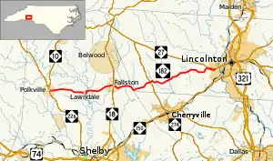North Carolina Highway 182 (NC 182) is a primary state highway in the U.S. state of North Carolina. It serves to connect the towns of Polkville and Lawndale with the city of Lincolnton.