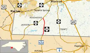 NC 522 is a short 5.84-mile (9.40 km) two-lane rural highway in Union County, passing through an area of mixed forest and farmland.[3]