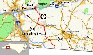 | Rutherford | Lake Lure | 20.3 | 32.7 | East end of concurrency with US 64/US 74A | |||