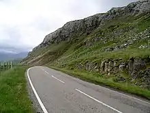 The area contains a number of limestone caves. The most well known of these is Smoo Cave, a large sea cave near Durness. This cave is unique within the UK in that its outer chamber was formed by the action of seawater, while the inner chambers were formed by fresh water.[11] Its entrance 15 metres high, is the largest entrance of any sea cave in the British Isles.[12] Archaeological excavations have found evidence of human habitation dating back to the Mesolithic period.[13] The cave became well known after Sir Walter Scott visited it in 1814. Another notable cave site is the Inchnadamph Bone Caves. At these caves, remains of Eurasian lynx, brown bear, Arctic fox, reindeer and polar bears have been found; as well as human remains dated between 4,515 and 4,720 years old.[14] Uamh an Claonaite, Scotland's longest cave is partly located below these Bone Caves.