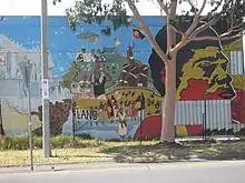 The mural was proposed for inclusion on the Darebin Heritage Overlay in 2011.[4] The Mural represents Victoria's Aboriginal culture and history and contains strong political statements about the incarceration of Aboriginal people[5] Among other elements, it depicts large-scale renderings of historical artworks by Tommy McRae and William Barak, a representation of Aboriginal men manacled in neck chains taken from a well known photograph, and the Lake Tyers land rights campaign of the 1970s.[6]