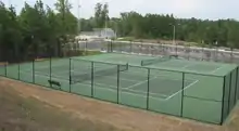 Amenities include a regulation-size baseball field with lights and bleachers, two regulation tennis courts, a multipurpose field for soccer, ultimate, football, rugby, and other field sports approximately 125 by 85 yards with bleachers (approx. 150 seats), a restroom/concession building, a picnic shelter with pond view, a playground, a 1/4-mile asphalt walking trail that loops the pond, and parking.