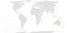 The northern giant petrel is pelagic and is found throughout the Southern Ocean north of the Antarctic Convergence Zone, and north through Chile, Argentina, South Africa, New Zealand, and half of Australia. Over 4,500 pairs nest on islands in the South Georgia group. They also nest on some of the Chatham Islands, Kerguelen Islands, Crozet Islands, Macquarie Island and others. Their overall range is 82,600,000 km2 (31,900,000 sq mi).[12]