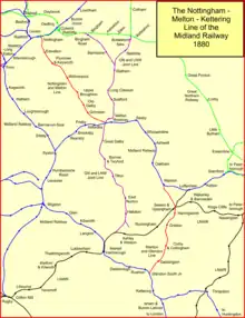 In November 1871 the Midland Railway deposited a Bill before Parliament entitled the "Nottingham and Rushton Lines Act". It proposed a line between Nottingham and Saxby, 21+12 miles long. It would pass some distance north of Melton Mowbray, and generally duplicate the Melton to Saxby section of the existing Peterborough line. The "Manton and Rushton Line" was a route 14 miles long between Manton on the Syston and Peterborough Railway, and Rushton on the Midland Main Line, north of Kettering. Included in the proposals was a spur linking the Nottingham and Saxby line to Melton Mowbray station.[10]