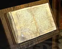 The earliest extant copy of the NPL is the so-called Synod Scroll (Sinodal'nyy[4]), dated to the second half of the 13th century. First printed in 1841, it is currently preserved in the State Historical Museum. It is the earliest known manuscript of a major Old East Slavic chronicle, predating the Laurentian Codex of the Primary Chronicle by almost a century.[5] In the 14th century, the Synod Scroll was continued by the monks of the Yuriev Monastery in Novgorod.[6] Other important copies of the Novgorod First Chronicle include the Academic Scroll (Akademicheskii) and Commission Scroll (Komissionnyy[4]), both dating to the 1440s,[5] and the Tolstoi (Tolstovoi) copy. This "Younger Redaction"[lower-alpha 1] contains entries from the year 854 up to 1447.[1]