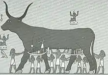 Nut /ˈnʊt/[2] (Ancient Egyptian: Nwt, Coptic: Ⲛⲉ), also known by various other transcriptions, is the goddess of the sky, stars, cosmos, mothers, astronomy, and the universe in the ancient Egyptian religion.[3] She was seen as a star-covered nude woman arching over the Earth,[4] or as a cow. She was depicted wearing the water-pot sign (nw) that identifies her.