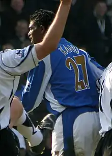 Kanu was a free agent following his departure from West Brom, and he signed for Portsmouth on a one-year deal shortly before the start of the 2006–07 season.[39] Pompey had undergone a revival in the second half of the previous campaign, following the return of Harry Redknapp as manager, avoiding relegation by four points after being in serious danger at the turn of the year. At the start of the 2006–07 season, they were undefeated in their first five games, during which they did not concede a single goal. Kanu made his debut for Portsmouth as a substitute against Blackburn Rovers on 19 August 2006, the opening day of the 2006–07 Premier League season. He scored twice and missed a penalty.[40] Kanu went on to finish the season as the top goal scorer for Portsmouth, with 12 goals altogether. He then signed a new one year deal with the club.[41]