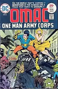 He was created by writer-artist Jack Kirby towards the end of his contract with the publisher following the cancellation of his New Gods series; it was reportedly developed strictly due to Kirby needing to fill his contractual quota of 15 pages a week.[2][3] As envisioned by Kirby, OMAC is essentially Captain America set in the future, an idea he had toyed with some years earlier while at Marvel Comics but had never realized.[3]