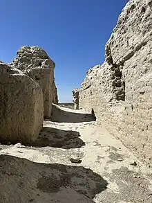 From 3rd century BCE to the 16th century CE, over 1,000 settlements have been identified in the oasis, mostly associated with the tepe.[6] Shishkin identified two types of tepe: a "monolithic" type with walls but no citadel, and a "two-level" type with a citadel and a shahrestan.[6] The survey led by Chiara Silvi Antonini developed a much more detailed typology, which the MAFOUB abandoned in favour of a simpler classification: 1) cities with a citadel, a shahrestan and a rabad; 2) cities with a citadel and a shahrestan only; 3) cities with a unique mound, such as mills, caravanserais, or kurgans; 4) open sites such as ceramic distribution zones, production zones etc.[7] The tripartite cities with a citadel, a shahrestan and a rabad are the most stable ones, appearing in the 2nd to 3rd century BCE (surrounding suburbs start appearing in the 5th century CE) and lasting at least until the Mongol and Timurid periods in the 13-15th centuries.[8]