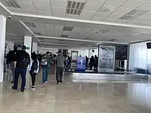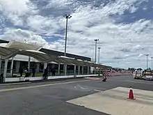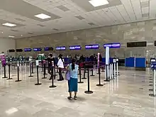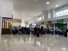 The passenger terminal is a single-story building with a total area of 7,548 square metres (81,250 sq ft). It accommodates both arrivals and departures for domestic and international flights. The departures area features a check-in area, a security checkpoint, and a departure concourse featuring a VIP lounge,[2][3] snack bars, souvenir shops, and eight gates that provide direct access to the apron, allowing passengers to board their planes by walking to the aircraft through a series of open-air walkways. The arrivals section is located at the southern end of the terminal and includes customs and immigration facilities, a baggage claim area, and an arrivals hall with car rental services, taxi stands, snack bars, and souvenir shops.