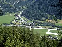 The next settlement up the Rhone valley is Obergesteln, which is located on a terminal moraine of the Rhone glacier in the Rhone valley, at an elevation of 1,353 m (4,439 ft). Obergesteln is overlooked by the mountains of the Sidelhorn, to the north, and the Pizzo Gallina, to the south.[7]