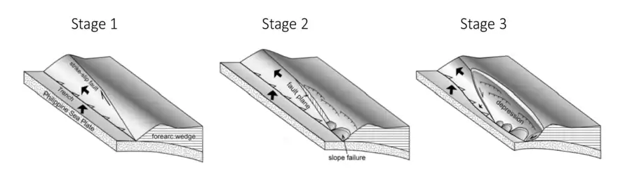 Simplified evolution diagram of the oblique subduction-induced tsunami. Stage 1: Formation of trench parallel strike slip fault owing to oblique subduction of the Philippine Sea Plate. The fault extended and reached the Ryukyu Trench. Stage 2: Movement of fault weakened the strength of the seaward slope. Resulting in several slope failures around the tip of the fault.[11] Stage 3: Ongoing slope failures further weakened the slope. A large seaward block then collapsed and slid.[11] During earthquake, the ground shaking caused the landward block to collapse seaward.[11] Resulting in the great tsunami.[11] Modified from Yukinobu et al., 2018.[11]