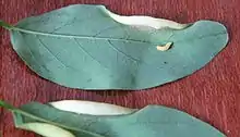 | Larva on locust leaf with gall | |