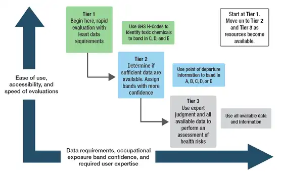 Tier 1, the qualitative tier, produces an occupational exposure band (OEB) assignment based on qualitative data from the Globally Harmonized System of Classification and Labeling of Chemicals (GHS); it involves assigning the OEB based on criteria aligned with specific GHS hazard codes and categories. These hazard codes are typically pulled from GESTIS, ECHA Annex VI, or safety data sheets.[7] The Tier 1 process can be performed by a health and safety generalist, and takes only minutes to complete with the NIOSH OEB e-tool. The e-tool is free to use and can be accessed through the NIOSH website.