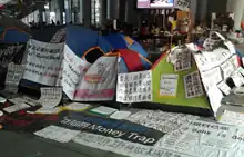 Echoing the global Occupy movement against corporate greed and economic inequality, the 'Occupy Central' campaign of Hong Kong started on 15 October 2011, with protestors tenanting the plaza beneath the HSBC headquarters in Central, an iconic landmark of the territory's central business district.[2][3] The plaza is the bank's property, but was deeded during construction in 1983 as an area dedicated to serve as a public pedestrian passage.[4] The Hong Kong encampment, aiming at creating an ideal community advocating "equality",[5] attracted a commune of occupiers including students, young professionals, activists, the unemployed and homeless.[6] As at 11 December 2011 and August 2012, there were around 20 and 10 campers respectively,[3] but more than 200 participants engaged in the campaign at its height.[5]