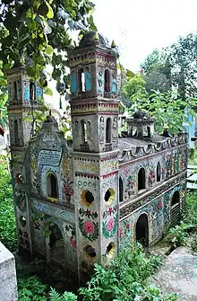 The other, and perhaps more important, cultural attraction here is the town’s cemetery. It is filled with very traditional examples of tomb construction in modern Mexico. Most of the tombs here are covered over with small-scale churches, cathedrals and houses, which are brightly painted and/or tiled. Here preparations for one of the biggest days of the year are made, Dia de los Muertos.[1][2]