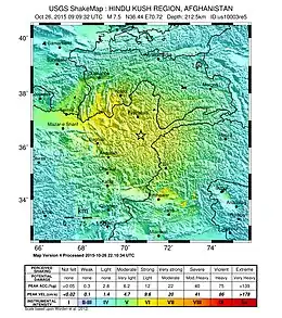 The October 2015 Hindu Kush earthquake was a magnitude 7.5 earthquake[1][2] that struck South Asia on 26 October 2015, at 13:39 AFT (14:09 PKT; 14:39 IST; 09:09 UTC)[1][2][3] with the epicenter 45 km north of Kuran wa Munjan, Afghanistan,[4][5] at a depth of 231.0 km.[6]