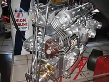 The Offenhauser engine, familiarly known as the "Offy", was an overhead cam monoblock 4-stroke internal combustion engine developed by Fred Offenhauser and Harry Arminius Miller.[4] Originally, it was sold as a marine engine. In 1930 a four-cylinder 151 cu in (2.47 L) Miller engine installed in a race car set a new international land speed record of 144.895 mph (233.186 km/h). Miller developed this engine into a twin overhead cam, four-cylinder, four-valve-per-cylinder 220 cu in (3.6 L) racing engine. Variations of this design were used in midgets and sprints into the 1960s,[5] with a choice of carburetion or Hilborn fuel injection.[6] When both Miller and the company to whom he had sold much of the equipment and rights went bankrupt in 1933, Offenhauser opened a shop a block away and bought rights to engines, special tooling and drawings at the bankruptcy auction, and he and other former Miller employees took over production. They and former Miller employee, draftsman Leo Goossen, further developed the Miller engines into the Offenhauser engines.
