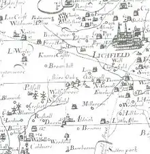 The settlement is first recorded (as "Brownhill") on Robert Plot's 1680 map of Staffordshire, at which time it was a hamlet within the manor of Ogley Hay, which in turn was part of the parish of Norton Canes.[4] Ogley Hay itself had existed since at least the 11th century and is mentioned in the Domesday Book,[2] although the 1801 census lists it as having a population of only 8 people.[5] Beyond Ogley Hay lay Catshill, another hamlet which pre-dated Brownhills and which lay within the parish of Shenstone.